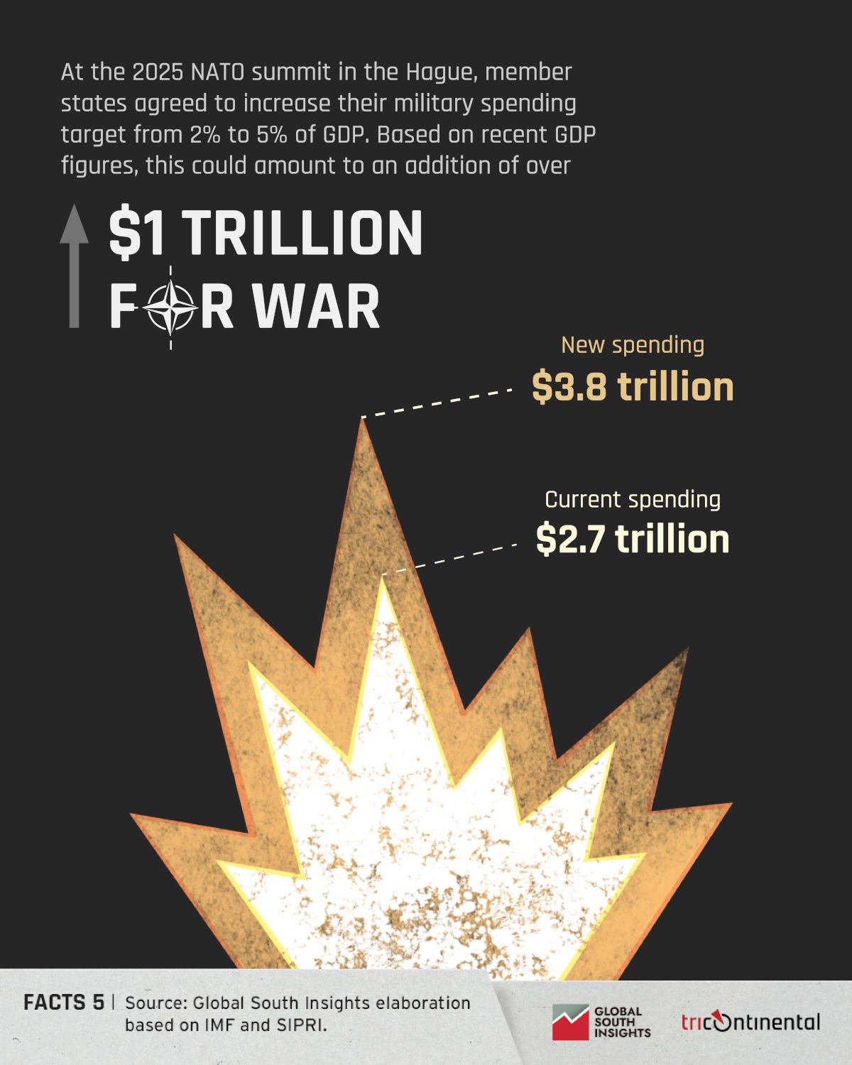 Statele NATO au fost de acord, fără nicio împotrivire, cu cererea Președintelui SUA Donald Trump de a crește cheltuielile militare la 5% din PIB. Din cauza variatelor frâne neoliberale asupra datoriei, vor fi nevoite să taie cheltuielile sociale pentru a acoperi creșterea producției și achizițiilor de armament. Germania, chiar dacă are cel mai mare PIB din Europa, e împotmolită în probleme sociale adânci; de exemplu, 21,1% din populația Germaniei se confruntă cu riscul sărăciei sau al excluziunii sociale. Guvernul german, condus de Cancelarul Friedrich Merz, s-a angajat la cheltuieli militare de €650 miliarde în următorii cinci ani, pentru a atinge obiectivul de 5% din PIB până în 2035 - o sumă pe care până și Financial Times o găsește ‘uluitoare’. Pentru a respecta acest angajament, Germania va trebui să găsească aproximativ €144 miliarde pe an, în principal prin realocări bugetare - adică austeritate - și mai multe împrumuturi - adică datorii (creșterea impozitelor este improbabilă, chiar și sub forma unor taxe regresive pe valoarea adăugată aplicate consumului).